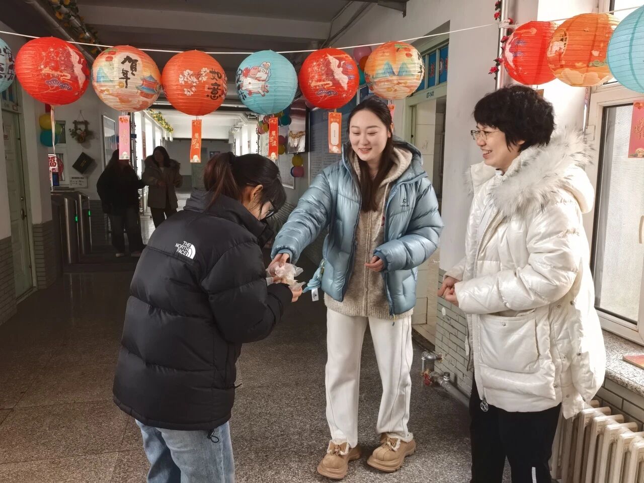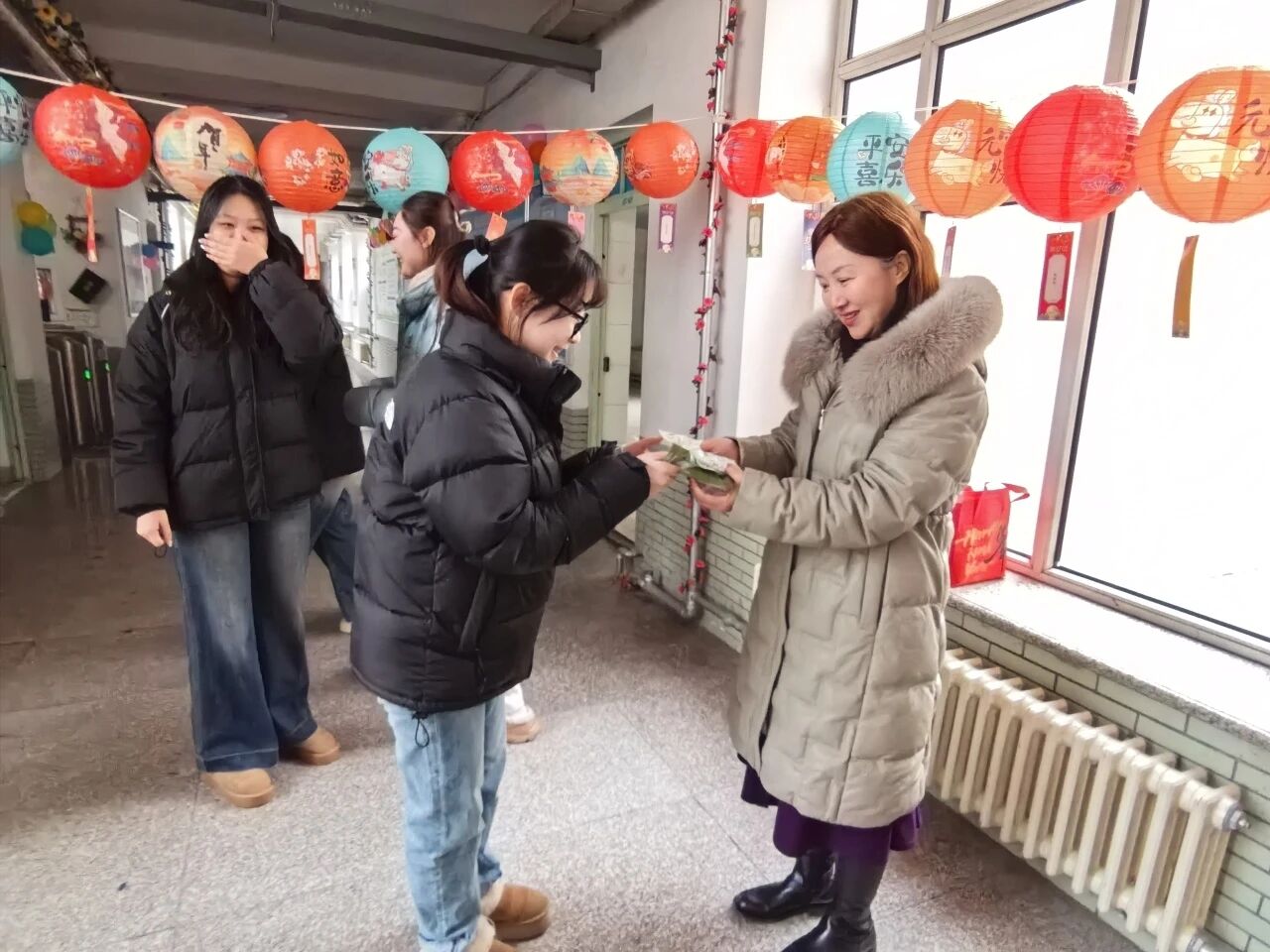 发汤圆:猜灯谜活动结束后,张洪梅院长、李萍老师、谷硕老师为现场学生分发汤圆。老师们将一份份汤圆递到学生手中,与同学们亲切交流,了解学生的学习与生活情况。学生们接过汤圆,在甜蜜的氛围中感受着节日的温暖与关怀。